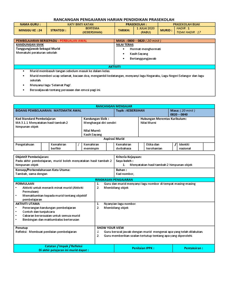 Rancangan Pengajaran Harian Prasekolah Pdf